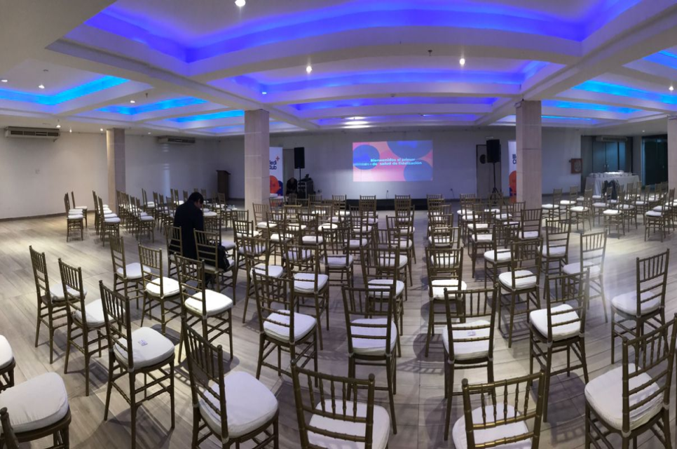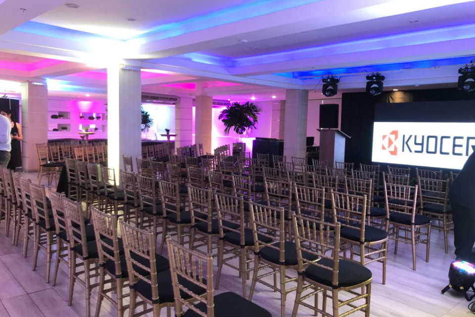 Incluye: salón 5 horas de servicio, sillas, mesas, tarima, atril, sonido, proyector, micrófonos, pizarra, papelógrafo, servicio de café y agua.